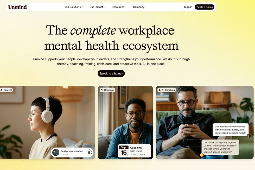 Unmind is a workplace mental health platform used by Standard Chartered, Uber, Samsung, Disney, Diageo, and British Airways, supporting 2.5 million employees worldwide (Unmind, 2025). Its proactive model leans into science-backed content, AI coaching, and a global practitioner network. Standard Chartered's use of Unmind is one of the most visible public case studies of a global bank adopting this kind of platform.